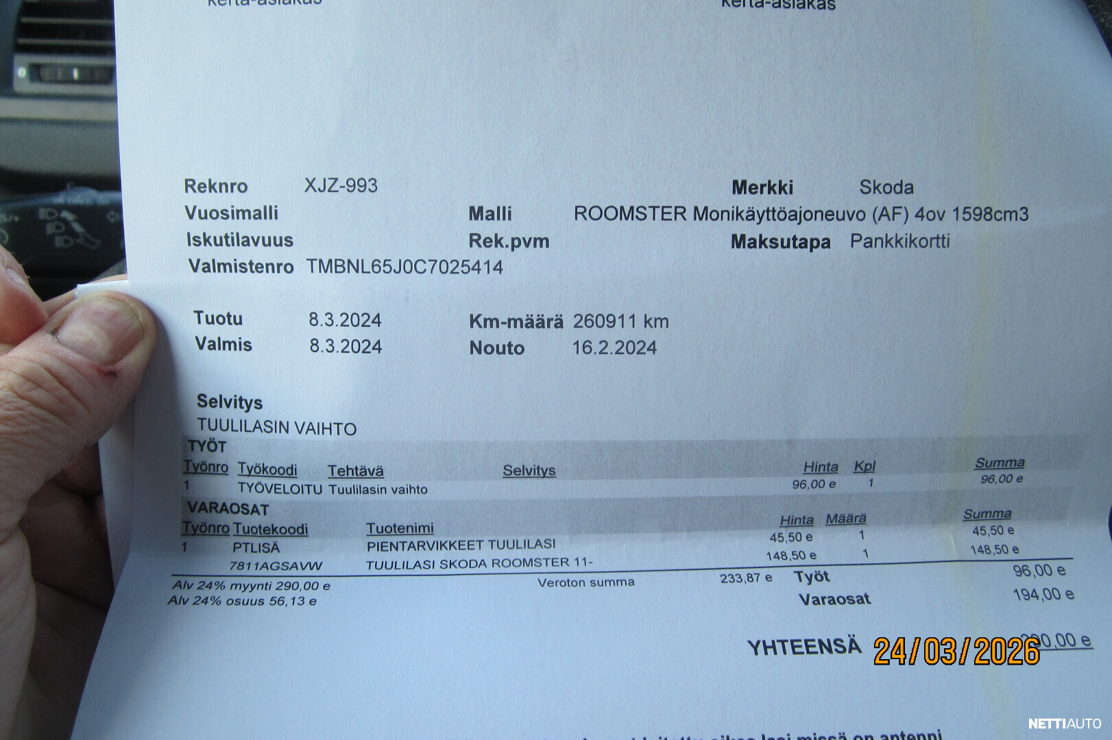 HYVIN ASIALLINEN SKODA ROOMSTER 1,6 TDI. AJ. 292 TKM HUOLTOKIRJALLA. JAKOPÄÄ 182 TKM. TAKAISKARIT, JARRUT 12/25. PIENI KULUTUS 4-4,5 L/100 KM. PIENET KÄYTTÖKULUT. ILMASTOINTI, KAUKO- OHJATTAVA WEBASTO (TOIMII). VAK. NOP.SÄÄDIN. REK. PAKETTIAUTOKSI. LISÄPENKIT MUKAAN. KAHDET RENKAAT VANTEINEEN. LEIMAA 1/ 2027. HYVÄ LAMANTAPPAJA!!